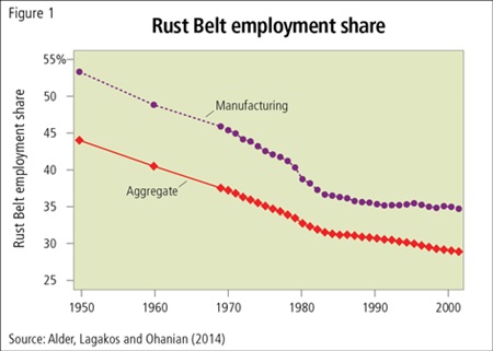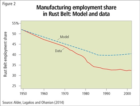 This historical pattern also suggests that whatever depressed this region for decades eventually moderated sufficiently such that the Rust Belt’s employment share stabilized after 1985, but at a much lower level. In “Competitive Pressure and the Rust Belt: A Macroeconomic Analysis” (2014), Simeon Alder, David Lagakos and I analyze how lack of competitive pressure in product and labor markets in Rust Belt industries contributed both to the Rust Belt’s decline and to its ultimate stabilization.