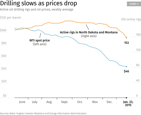 The Bakken energy production region of western North Dakota and eastern Montana faces a steep drop in oil prices. The most widely quoted U.S. price for oil, the price of West Texas Intermediate (WTI) at Cushing, Okla., was close to $108 per barrel in June, declined to about $90 in early October and fell below $50 in January. The drop in oil prices has slowed drilling activity, and energy companies have announced that they will scale back future drilling operations.