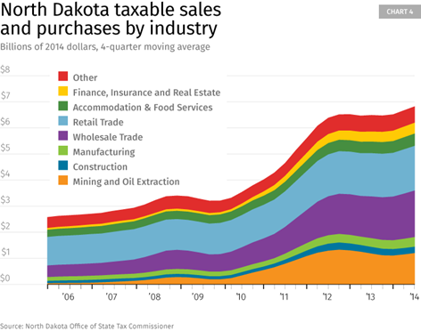 Sales from the oil and gas industry contributed some of the largest gains in taxable sales during recent years. Other industries that support energy production, particularly wholesale trade, have also made substantial contributions to taxable sales growth. Geographically, the largest gains in taxable sales have come from the energy production region in the western part of the state.