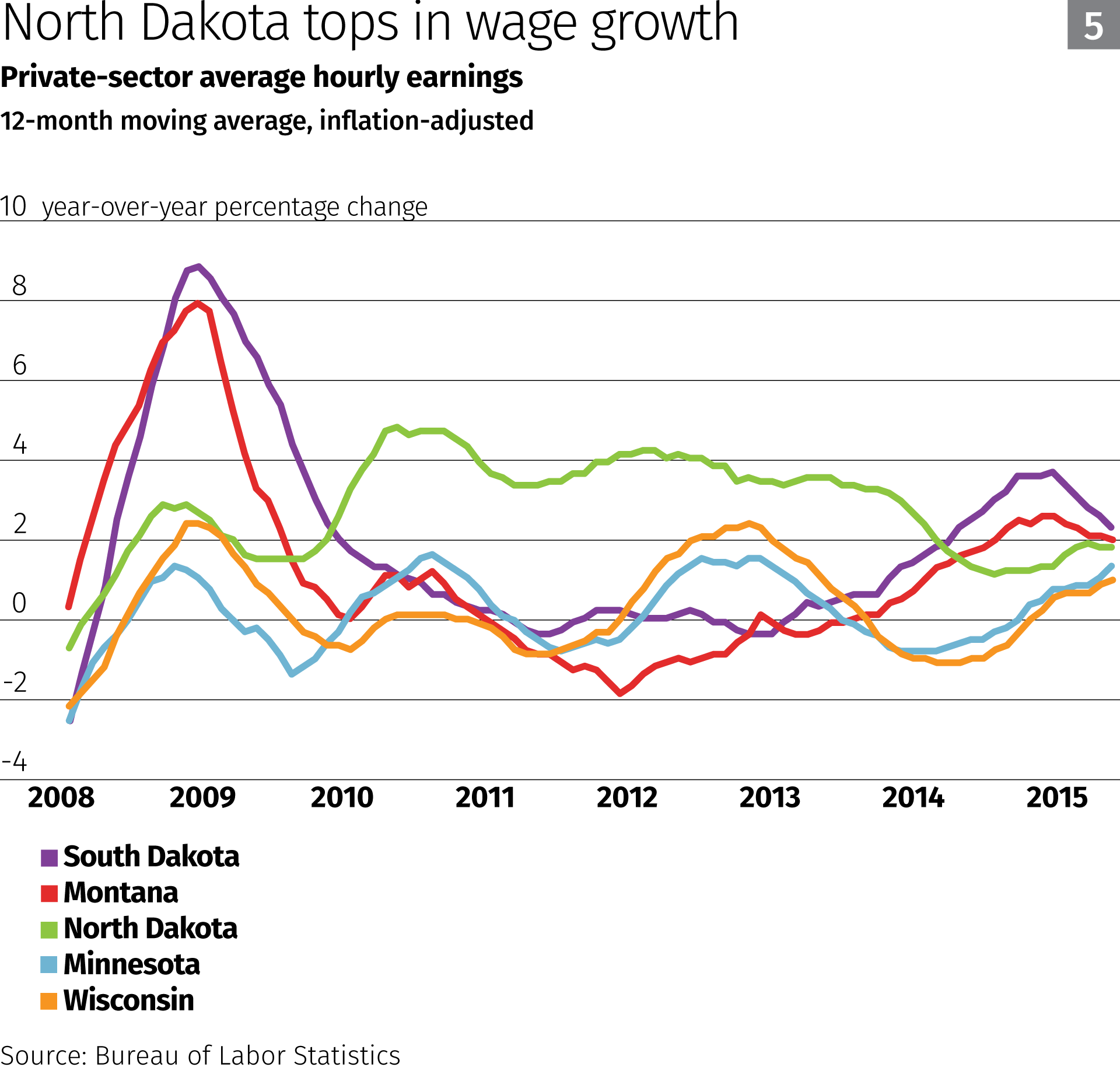 Among district states (Chart 5), North Dakota dwarfs the rest in wage increases since the recession due to strong labor demand, stemming in large part from rapid oil and gas development in the western part of the state. North Dakota earnings aren’t rising as fast as they were before oil prices dropped in 2014, but wages still grew over 1.8 percent year over year in 2016.