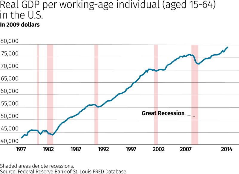 2 The exact amount of time required for per capita output to return to its prerecession peak depends somewhat on the population measure used. If instead the civilian non-institutional population measure (FRED label CNP16OV) were used, then the amount of time would have been longer, roughly seven years. The difference from the results in the figure reflects demographic factors that cause the working-age population to grow less rapidly than the population as a whole.