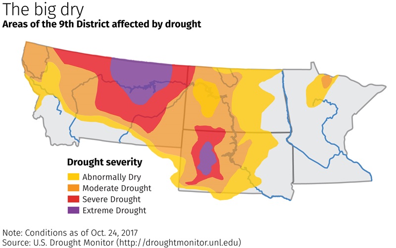 The persistent dryness has imposed hardship on agricultural producers. In many areas, rains have come too late to stave off major crop losses. The U.S. Department of Agriculture (USDA) predicts dramatically lower production of spring wheat, corn and other crops this fall compared with 2016 (see table). North Dakota’s spring wheat production is projected to drop by almost one-third year over year to 186 million bushels. Montana farmers are on pace to harvest 76 million bushels of winter wheat in 2017, the lowest production since 2004—another drought year.