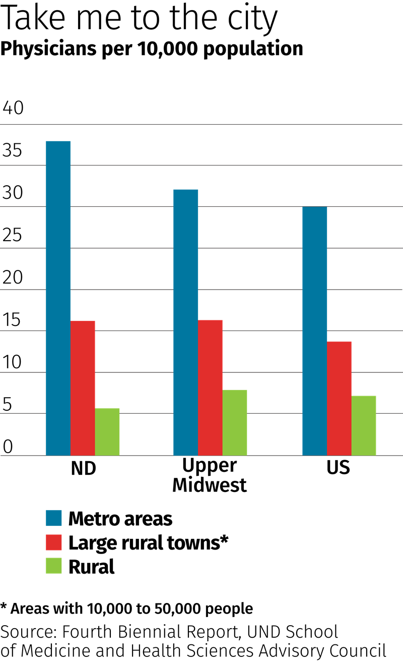 Rural areas of the state have about five times as many people per physician as metro areas such as Fargo and Bismarck, according to a recent report by the University of North Dakota. Thirteen counties have no practicing doctors at all.