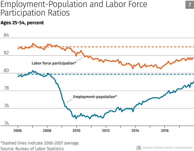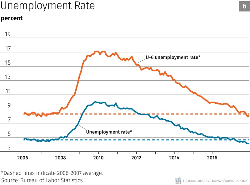 Next let’s look at our maximum employment mandate. One of the big questions I continue to wrestle with is whether the labor market has fully recovered or if there is still some slack in it. Over the past few years, some people repeatedly declared that we had reached maximum employment and that no further gains were possible without triggering higher inflation. And, repeatedly, the labor market proved otherwise. Chart 6 shows that the headline unemployment rate has fallen from a peak of 10 percent to 4.1 percent, below its precrisis level. We also look at a broader measure of unemployment, what we call the U-6 measure, which includes people who have given up looking for a job or are involuntarily stuck in a part-time job. The U-6 measure peaked at 17.1 percent in 2010 and has fallen to 8.0 percent today, also below its precrisis level. But these measures still leave out a large number of people who might prefer to work if better job opportunities were available to them.