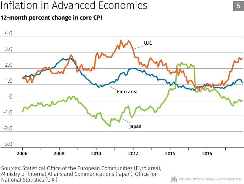 Now let’s look around the world. Most major advanced economies have been suffering from low inflation since the global financial crisis. It seems unlikely that the United States will experience a surge of inflation while the rest of the developed world suffers from low inflation. Since the June FOMC meeting, headline inflation has increased in the United Kingdom due to last year’s sterling depreciation resulting from Brexit, but headline inflation has been roughly flat in other advanced economies. As you can see in Chart 5, with the exception of the U.K., core inflation rates in advanced economies continue to come in below their target rates.