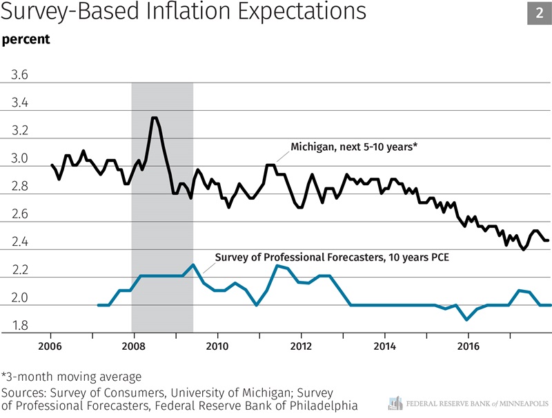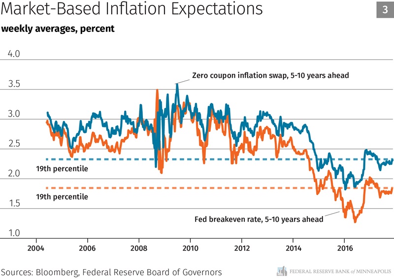 Next let’s look at inflation expectations—or where consumers and investors think inflation is likely headed (Chart 2). Inflation expectations are important drivers of future inflation, so it is critical that they remain anchored at our 2 percent target. Here the data are mixed. Survey measures of long-term inflation expectations are flat or trending downward. (Note that the Michigan survey, the black line, is consistently elevated relative to our 2 percent target. What is important is the trend, rather than the absolute level.) The Michigan survey has found inflation expectations trending downward over the past few years, and they remain near their lowest-ever reading. In contrast, professional forecasters seem to remain confident that inflation will average 2 percent. While the professional forecast ticked upward slightly earlier this year, those readings have ticked back down again since the June FOMC meeting.