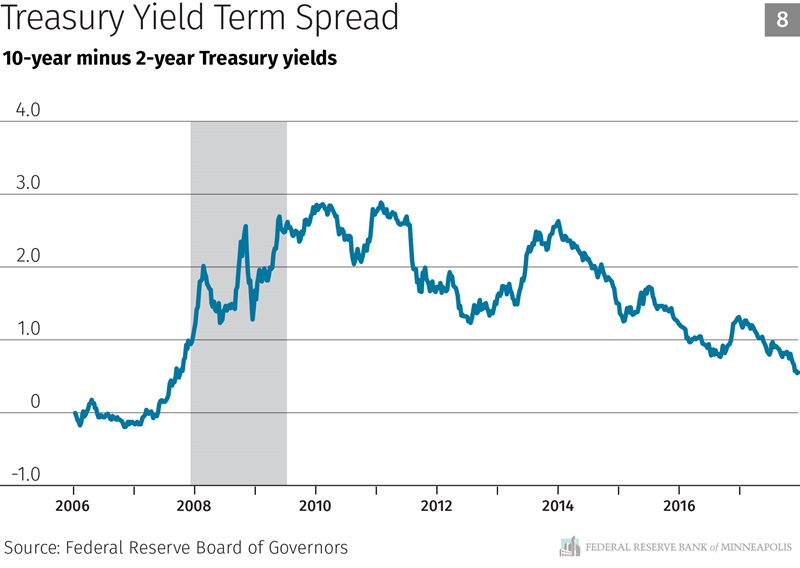 The yield curve term spread, the difference between 10-year and 2-year Treasury yields, has fallen from around 1.45 percent before the FOMC started raising rates in late 2015, to approximately 0.51 percent today (Chart 8). This flattening of the yield curve is an important new development this year. An inverted yield curve, where short rates are above long rates, is one of the best signals we have of elevated recession risk and has preceded every single recession in the past 50 years.