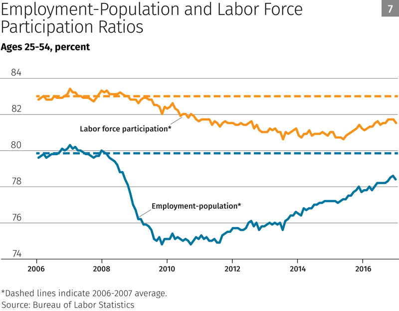One of the big surprises during late 2015 through early 2017 was how strong the job market was (creating an average of 200,000 net jobs per month, which is much higher than the 80,000 to 120,000 jobs per month needed to keep up with (trend) labor force growth); yet the unemployment rate remained fairly flat near 5 percent. This surprised us a bit because it suggests that there were many more people who were interested in working than historical patterns predicted. That storyline has lost some steam in recent months: Job gains have slowed to 121,000 per month over the past three months, while the unemployment rate has fallen to 4.3 percent as labor force growth has declined. Some other measures we look at are the employment-to-population ratio and the labor force participation rate, which capture what percentage of adults are working or in the labor force. We know these are trending downward over time due to the aging of our society (as more people retire, a smaller share of adults are in the labor force). To adjust for those trends, I prefer to look at these measures by focusing on prime working-age adults. The next chart shows that in both measures, there still appears to be more labor market slack than before the crisis.