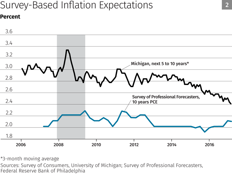 But perhaps inflationary pressures are building that we aren’t yet seeing in the data. I look at wages and costs of labor as potentially early warning signs of inflation around the corner.3 If employers have to pay more to retain or hire workers, eventually they will have to pass those costs on to their customers. Ultimately, those costs must show up as inflation. But we aren’t seeing a lot of movement in these data. The red line is the employment cost index, a measure of compensation that includes benefits and that adjusts for employment shifts among occupations and industries. It has been more or less flat over the past six years, though it ticked up modestly since the March FOMC meeting. The blue line is the average hourly earnings for employees. The growth rate of hourly earnings has fallen since the March meeting—from 2.8 percent to 2.5 percent—and remains low relative to the precrisis period. In short, the cost of labor isn’t showing signs of building inflationary pressures that are ready to take off and push inflation above the Fed’s target.