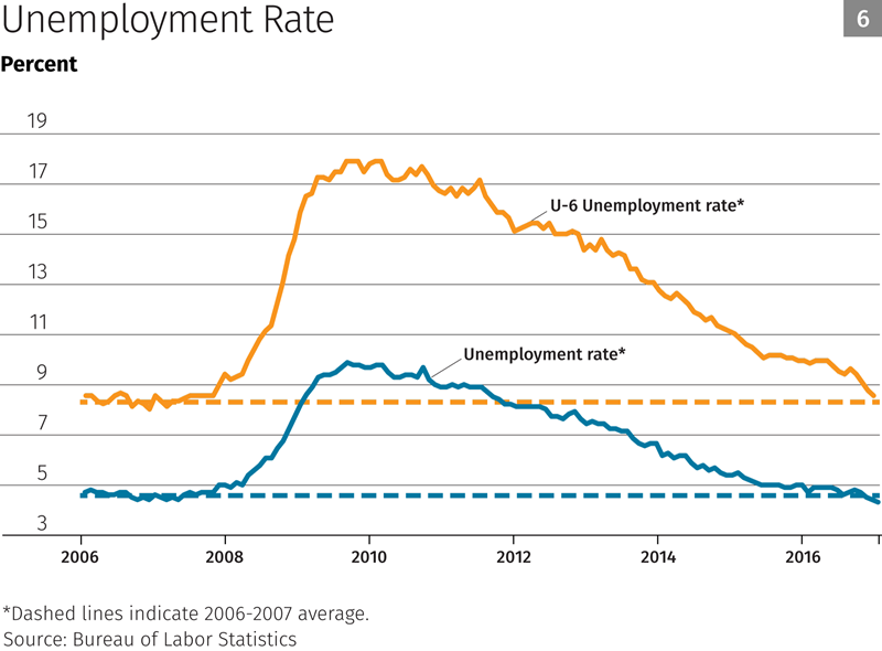 Next let’s look at our maximum employment mandate. One of the big questions I have been wrestling with is whether the labor market has fully recovered or if there is still some slack in it. Over the past couple of years, some people repeatedly declared that we had reached maximum employment and no further gains were possible without triggering higher inflation. And, repeatedly, the labor market proved otherwise. The headline unemployment rate has fallen from a peak of 10 percent to 4.3 percent, below the level it was at before the financial crisis. But we know that measurement doesn’t include people who have given up looking for a job or are involuntarily stuck in a part-time job. So we also look at a broader measure of unemployment, what we call the U-6 measure, which includes those workers. The U-6 measure peaked at 17.1 percent in 2010 and has fallen to 8.4 percent today, which is close to its precrisis level.
