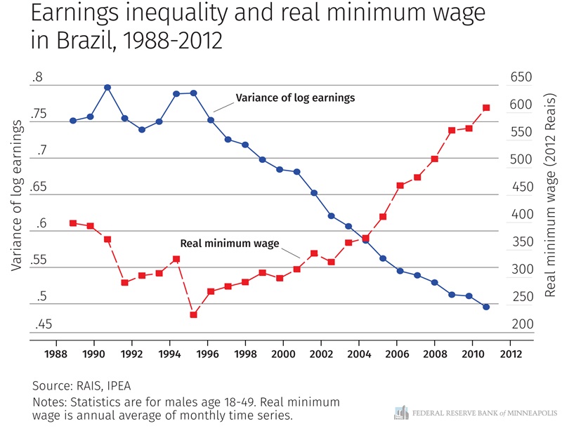 Engbom, a Princeton economist, and Institute visiting scholar Moser of Columbia University analyze the consequences of minimum wage changes in Brazil, specifically, to see if its 119 percent increase in inflation-adjusted minimum wage between 1996 and 2012 can explain a substantial decline in wage inequality that occurred over the same time. The data display a remarkable inverse pattern (see figure). Did the rise in minimum wage cause the decline in inequality? And if so, how?