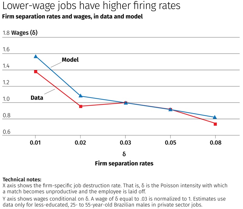 The model works well. Once calibrated to key characteristics of Brazil’s economy, it generates a very close fit to actual Brazilian data on wages, employment and job stability. In one key chart, Pessoa de Araujo shows that her mathematical model replicates the negative empirical relationship between firing rates and wages. (See the accompanying figure.) The model also matches data on employment distribution at low-firing and high-firing rate companies.