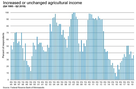 More than three-in-five district lenders responding to the survey (62 percent) reported that farm incomes decreased in the second quarter of 2019 from a year earlier, while only 8 percent said that incomes increased (see chart). Capital spending was also down, with 64 percent of lenders saying it decreased compared with 5 percent claiming it increased.