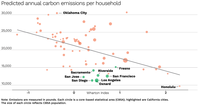 In a 2010 study, economists Edward Glaeser and Matthew Kahn estimate carbon dioxide emissions for 66 U.S. metropolitan areas and hypothesize: “It is certainly possible that land-use restrictions are actually pushing people away from lower emission areas into higher emission areas,” they write. “This topic seems to merit future research.”