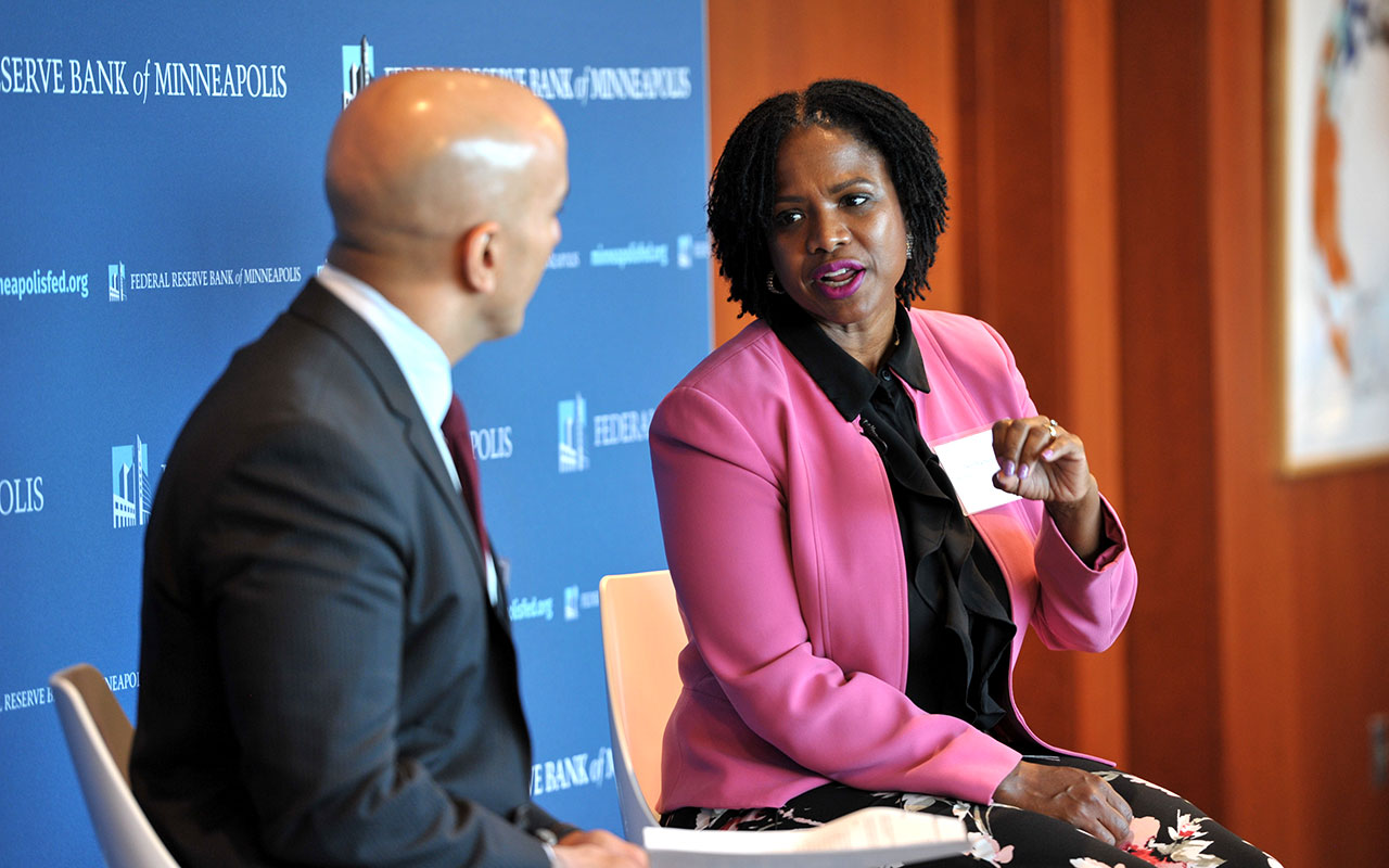 Over lunch, attendees participated in a question-and-answer session with Sondra Samuels of the Northside Achievement Zone (NAZ), a nonprofit organization that is committed to closing the achievement gap and ending generational poverty in North Minneapolis. Though just miles from the Minneapolis Fed, North Minneapolis exemplifies the types of challenges that motivated the founding of the Institute. Closely modeled after the Harlem Children’s Zone, NAZ has a dual focus on education and support for the whole family. Conference participants listened intently as Samuels explained the obstacles that such families encounter. NAZ’s holistic approach, with coaches helping parents find housing, earn a GED or place a child into a quality preschool, is already paying dividends, Samuels said. Parents are getting back to work, and kids are missing less school. Some critics contend that NAZ is too expensive, but Samuels asked, “Compared to what?” Low investment in these children and young families could ultimately cost society much more, in lives lost to violence, crime or low achievement.