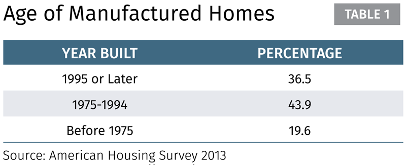 As shown in Table 1, about 20 percent of the manufactured homes in the U.S. in 2013 was built before the HUD code took effect in 1976. An additional 44 percent was built between 1975 and 1994, or mostly before the significant 1994 upgrades to the HUD code.