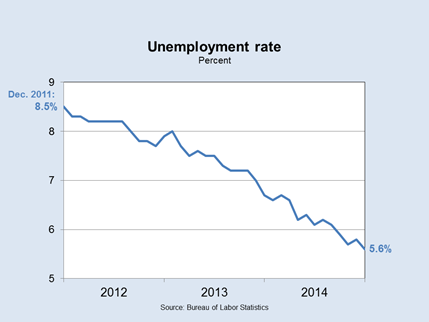 In December 2011, the unemployment rate was 8.5 percent. Since that date, the unemployment rate has fallen to 5.6 percent. The fall was especially rapid in 2014. However, the unemployment rate remains elevated compared to the FOMC’s assessments of its long-run value.