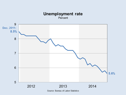In December 2011, the unemployment rate was 8.5 percent. Since that date, the unemployment rate has fallen to 5.6 percent. The fall was especially rapid in 2014. However, the unemployment rate remains elevated compared to the FOMC’s assessments of its long-run value.