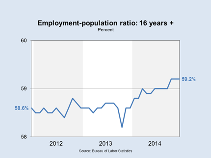 The unemployment rate is the most widely known measure of labor market performance. But there are good reasons to view it as only one of many useful labor market metrics. Recall that, to estimate the unemployment rate, the Census Bureau asks people two questions: Are you working? And, if not, have you looked for work in the past four weeks? The unemployment rate measures the ratio of the second number—the recent job searchers—to the sum of the two numbers (the recent job searchers and the workers). This means that the unemployment rate can decline for two reasons: because more people are finding work or because fewer people are looking for work. Much of the decline in the unemployment rate over the past three years has occurred because the fraction of people who are looking for work has fallen. This characterization is borne out if we look at the evolution of the fraction of people over the age of 16 who have a job—what’s called the employment-to-population ratio.