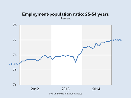 One simple way to adjust for this demographic impulse is to focus on people in their prime working-age years. Here, I’ve plotted the fraction of the population aged 25 to 54 who have a job.