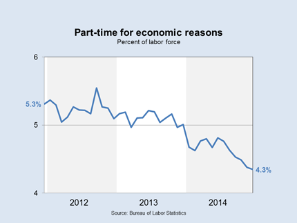Of course, just because someone has a job does not mean that they are necessarily fully employed. The Bureau of Labor Statistics reports each month on the number of Americans who are working part time, would like to work more hours, but are unable to obtain those additional hours. That fraction of the labor force has fallen over the past three years.