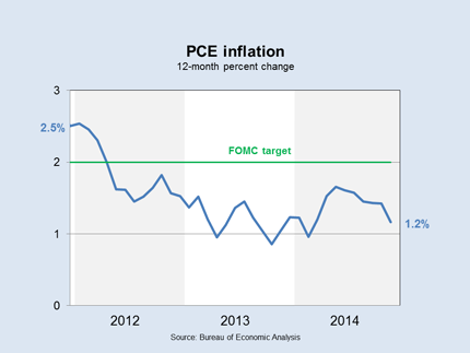 I see three main take-aways from this picture. First, PCE inflation has averaged (less than) 1.3 percent per year since December 2011. This is well under the FOMC’s 2 percent target. Second, PCE inflation has been below 2 percent for a long time—over two-and-a-half years. Finally, there was little pickup in inflation last year.
