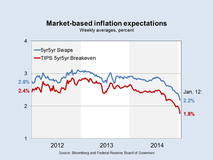 These series are not based on surveys. Rather, they are imputed from the prices of particular financial assets. They use those prices to construct measures of inflation expectations five to 10 years hence. Thus, the measure in late 2014 captures inflation expectations for the period 2019-2024. By looking this far ahead in time, we can strip away temporary, short-run influences on the economy and focus on market participants’ beliefs about the FOMC’s future intentions.