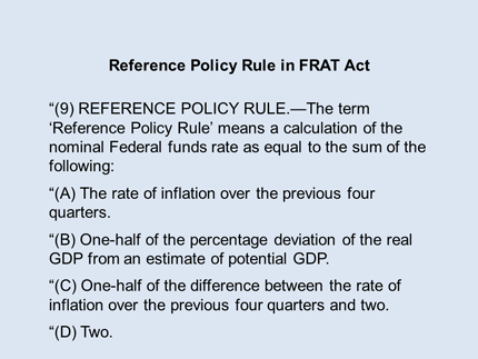 The FRAT Act contains a description of a specific reference policy rule for the FOMC. I’ve depicted that reference policy rule on this slide.