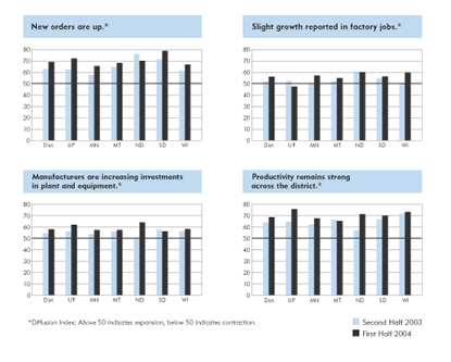 Producers noted a strong pickup in new orders during the second half of 2003 and expect rapid growth in the first half of 2004. The greatest increase in new orders was reported by large businesses and those located in the Dakotas. In response to the new orders, manufacturers ramped up production and prices. The increase in production has strained capacity somewhat, and businesses are reacting by increasing investment in plant and equipment. In addition, productivity increases were expected across the district. The increased production, prices and productivity should translate into higher profits in 2004. However, the increase in productivity dampened the need for workers, as manufacturers expected only slight increases in employment.
