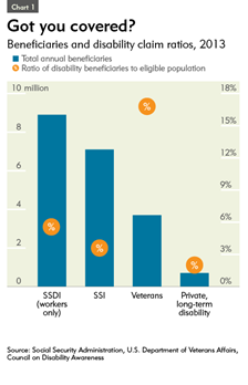 Statistics on private, long-term disability plans are less robust. Available data show that the annual number of private disability recipients has stayed mostly level since 2009, at around 660,000, according to the CDA, whose members represent 75 percent of this market. In comparison with the three federal plans, long-term private disability plans make up a small fraction of total beneficiaries and have a lower incidence rate (see Chart 1). The number of new beneficiaries is also much smaller for private plans—about 150,000 in 2013, compared with more 623,000 and 888,000 for SSI and SSDI, respectively.