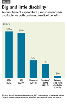 With much higher enrollments, federal disability programs dominate total program outlays. Combined, recipients of SSDI, SSI and veterans disability received almost $500 billion a year in cash and medical benefits (see Chart 2). The only private program in the same neighborhood is workers’ compensation, at $63 billion in benefits.