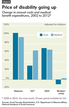 Costs for both cash and medical benefits have also been rising steadily for public disability plans, while those for workers’ compensation have stayed in check (see Chart 3). By comparison, total real costs for private, long-term disability plans (which are not listed in the chart) went up by 13 percent from 2009 to 2013, to about $10 billion, according to the CDA.