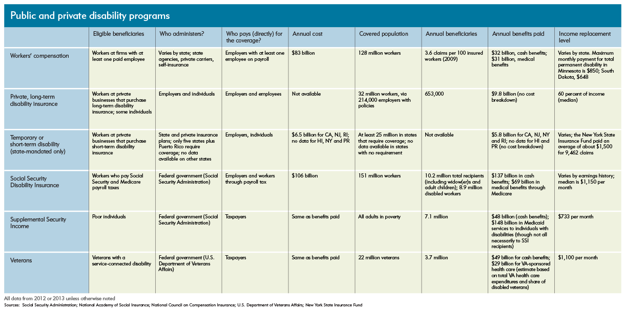 Generally speaking, most coverage comes through an insurance model, where there are distinct candidate pools, upfront costs to potential beneficiaries (and/or their employers) and defined benefits for those qualifying. Others, like SSI and VA, are designed more like a social safety net; these programs provide defined benefits for qualified individuals, with no payment required.