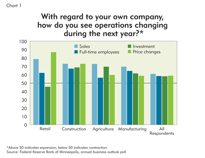 Wages are also expected to rise moderately, with 71 percent seeing 2 percent to 3 percent increases. In North Dakota, however, 53 percent are forecasting increases of 4 percent or more. Among industry sectors, construction expects the largest wage increases, and the retail sector the lowest.