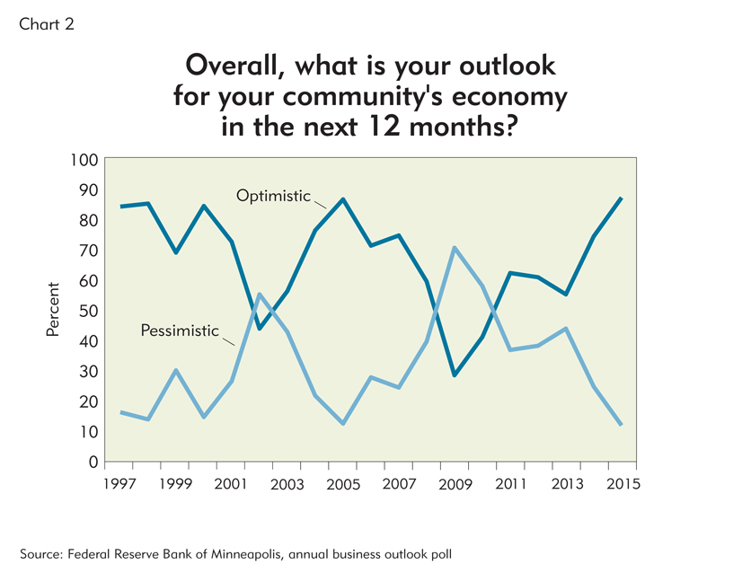 Nearly nine of 10 respondents are optimistic for their communities’ economies in 2015— the highest proportion in the history of the fedgazette’s annual business conditions poll conducted in November.