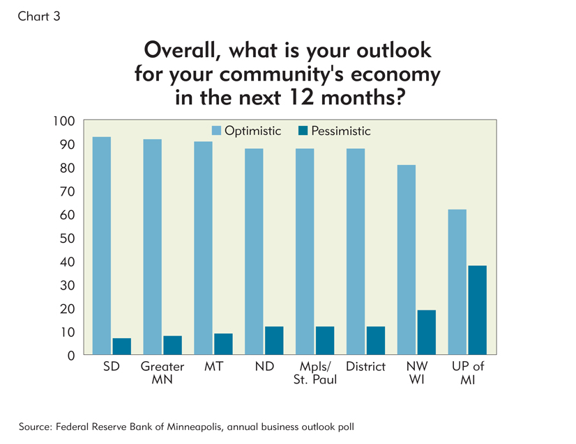 Optimism about state economies increased to record levels. High optimism levels are prevalent across the district except in the Upper Peninsula of Michigan (see Charts 2 and 3) . Respondents generally expect increased employment, business investment and consumer spending, with North Dakota and the Minneapolis-St. Paul area having the highest share of positive responses, while those in the U.P. expect flat employment and a drop in consumer spending. All industry sectors were positive about their state economies; the strongest results come from the finance and insurance and construction sectors.