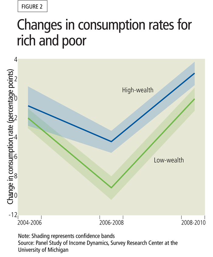Their key finding is that at the onset of the recession, the expenditure rate of low-wealth households declined significantly more than that of high-wealth households (see Figure 2). Both rich and poor households reined in spending, but the poor reduced expenditures about 4 percent more relative to the rich, suggesting that precautionary saving increases as wealth falls.