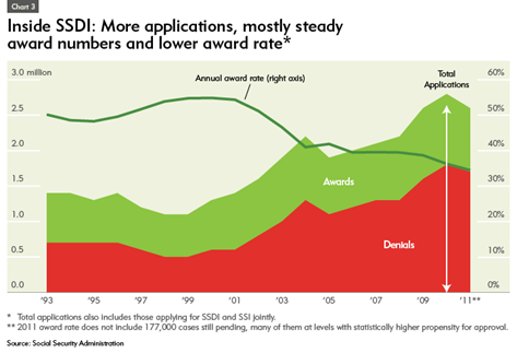 The rapid rise in applications and total enrollment for SSDI and SSI has prompted some to suggest a rubber-stamp mentality on the part of evaluators. Disability advocates disagree, pointing to dropping award rates.
