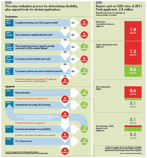 For many of the 1.2 million denied for medical reasons, however, the process has just begun, thanks to four levels of medical appeal whose approval rates vary considerably (see Chart 2). In an average year, between 55 percent and 60 percent of those initially denied for medical reasons appeal the decision, first to the so-called reconsideration level, which has a bare-bones award rate of just 8 percent.