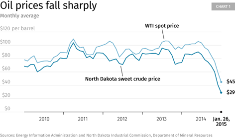 The Bakken energy production region of western North Dakota and eastern Montana faces a steep drop in oil prices. The most widely quoted U.S. price for oil, the price of West Texas Intermediate (WTI) at Cushing, Okla., was close to $108 per barrel in June, declined to about $90 in early October and fell below $50 in January. The drop in oil prices has slowed drilling activity, and energy companies have announced that they will scale back future drilling operations.