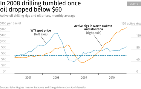 In 2008, energy companies sharply dropped drilling activity in North Dakota and Montana in response to decreases in oil prices. Oil prices were as high as $145 per barrel in July 2008; five months later, they dipped as low as $30—well below break-even prices at the time—which led to a corresponding drop in active drilling rigs from a peak of 96 in November 2008 to a low of 36 in May 2009 (see Chart 3). However, once oil prices climbed back above $60, drilling activity started to increase steadily.