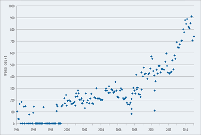 Words are a more intensively used monetary policy tool than ever before. As this figure shows, the FOMC’s post-meeting policy statements are longer than at any time since the first statement was issued in 1994.