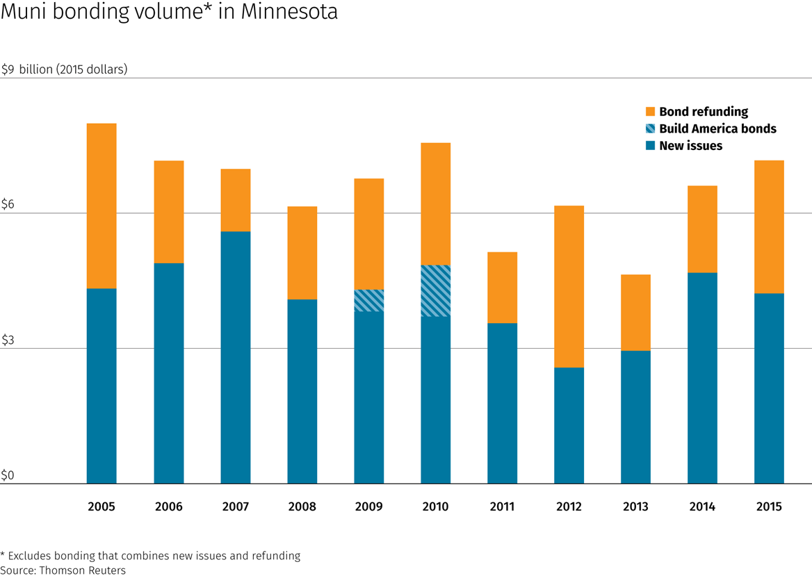 In the past two years, more and more Ninth District communities have jumped back into the market for municipal bonds, debt securities used to pay for large capital projects such as roads, wastewater treatment plants, athletic fields and school buildings. The 2008 financial crisis rocked the muni bond market, but since 2011 bond issuance in district states has seen a resurgence. The value of bond issues has increased, although issuance hasn’t returned to prerecession levels.