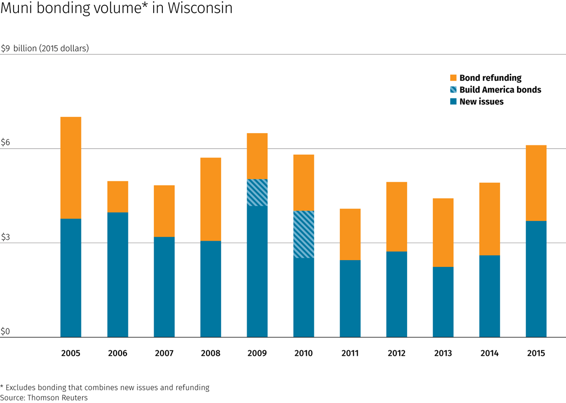In Wisconsin, bonding by K-12 schools fell during the recession but has since rebounded, according to the State Department of Public Instruction. In 2014, the value of bond issues, including refunding, surged to over $580 million, more than double the 2013 volume. Bonding in 2015 was almost $400 million.