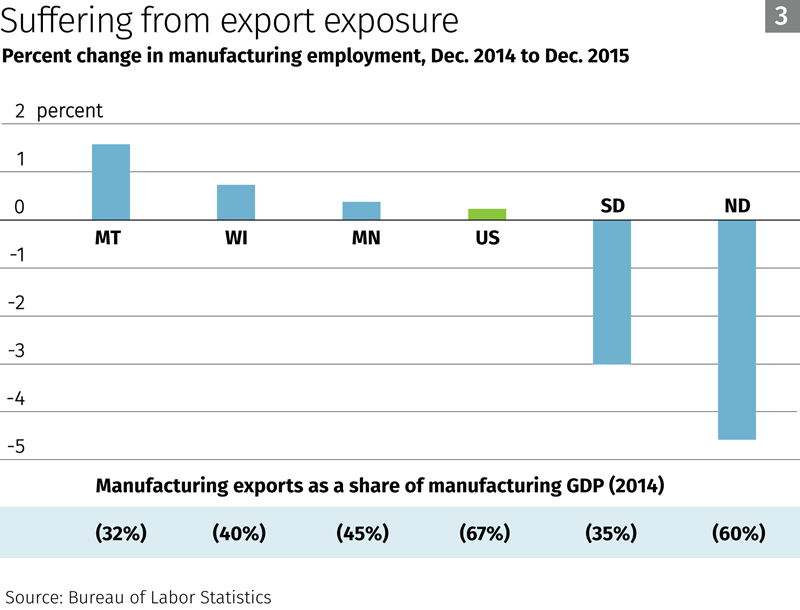 In addition, manufacturing employment in the district either grew weakly or decreased over the course of the year (Chart 3). The exception was Montana, where employment increased 1.6 percent. Among district states, manufactured exports vary as a share of state manufacturing GDP, ranging from about one-third in Montana and South Dakota to 60 percent in North Dakota.