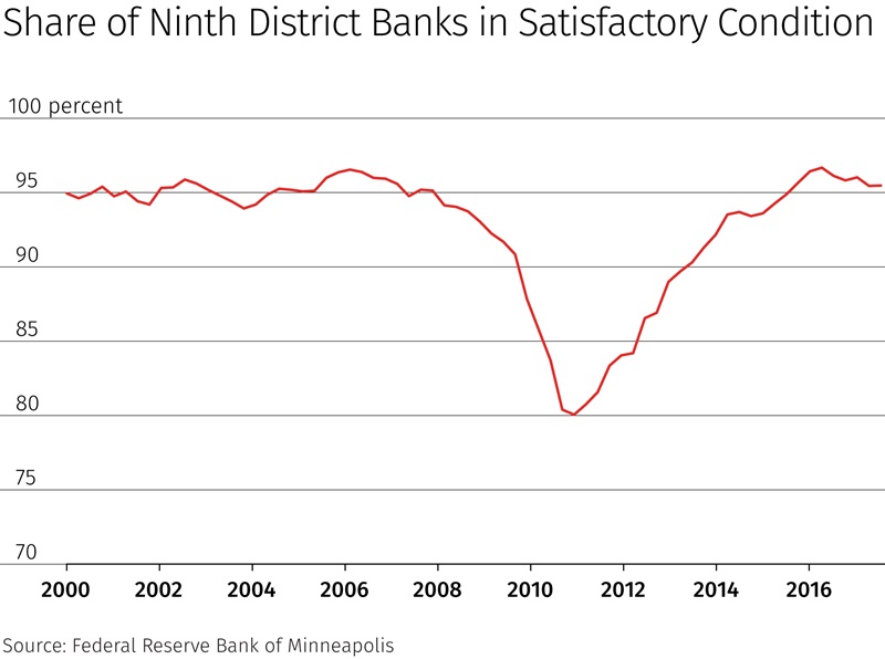 Currently, more than 95 percent of banks within the Ninth District have a CAMELS rating of 1 or 2, which we classify as being in “satisfactory” condition. The following figure shows the percentage of Ninth District banks rated in satisfactory condition back to 2001. The low point occurred at the end of 2010, when only 75 percent of the District’s banks were deemed to be satisfactory. This measure rose steadily during the 2011-15 period and is now back to levels typically seen in the precrisis period.