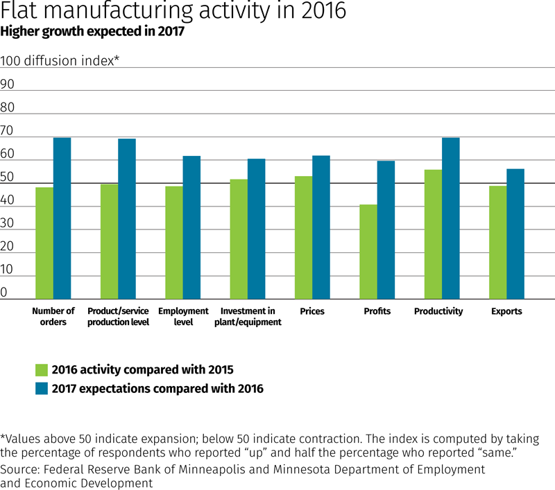 Despite treading water in 2016, Ninth District manufacturers were expecting moderate growth in the year ahead, according to a survey conducted in November and early December by the Federal Reserve Bank of Minneapolis and the Minnesota Department of Employment and Economic Development.