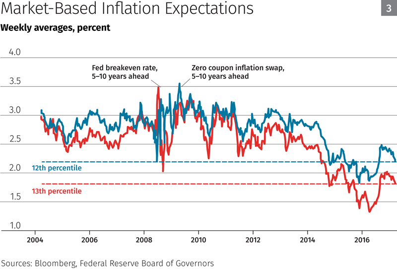 Next let’s look at inflation expectations—or where consumers and investors think inflation is likely headed. Inflation expectations are important drivers of future inflation, so it is critical that they remain anchored at our 2 percent target. Here the data are mixed. Survey measures of long-term inflation expectations are flat or trending downward. (Note the Michigan survey, the black line, is always elevated relative to our 2 percent target. What is important is the trend, rather than the absolute level.) The Michigan survey has been trending downward over the past few years and is now near its lowest-ever reading. In contrast, professional forecasters seem to remain confident that inflation will average 2 percent. While the professional forecast ticked upward slightly earlier this year, these readings are essentially unchanged since the March FOMC meeting.