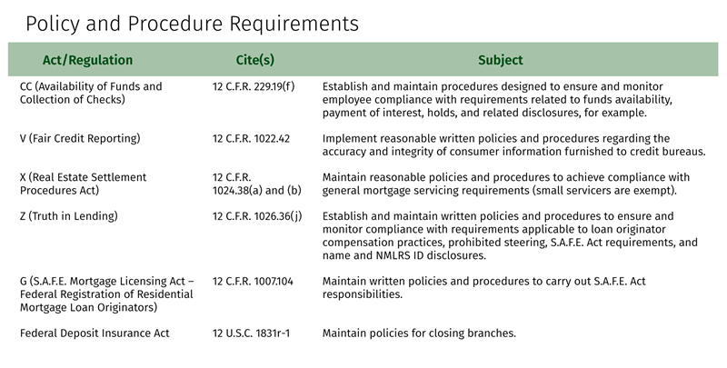 Do you know that some consumer protection acts and regulations require banks to have policies and procedures? Policies are one way that management communicates its commitment and expectations related to compliance, while procedures provide personnel with guidance on how to complete transactions or other processes. Generally, banks should adopt and implement policies and procedures that are appropriate for managing their risks. In addition, an act or regulation might specifically require the bank to adopt certain policies and procedures, as shown in the table below.