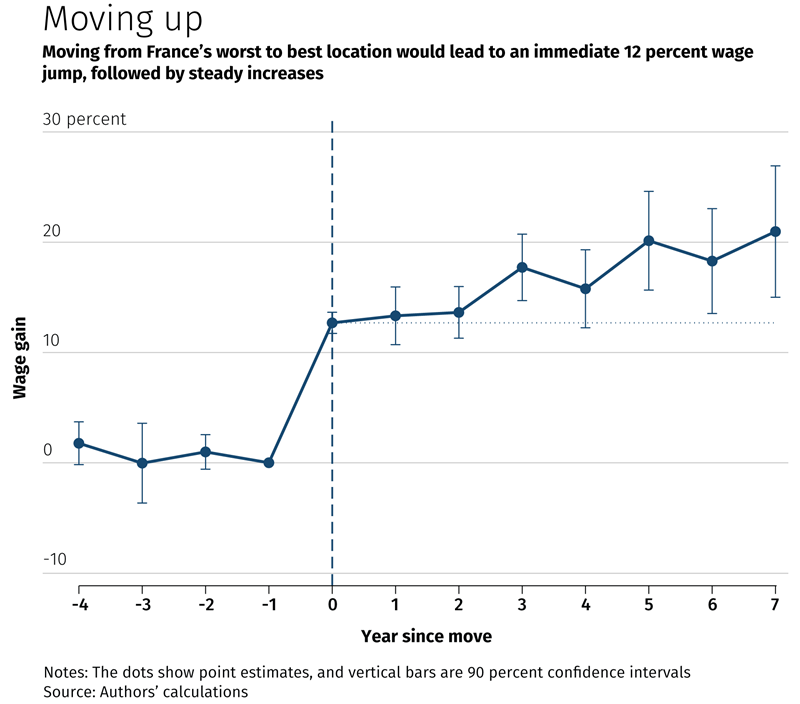 The economists first investigate what happens to wages of French workers who moved to better locations. They find that the average worker moving to the best municipality from the worst enjoyed an immediate 12 percent wage boost. More important for the “location as an asset” hypothesis, the move continued to pay off. “The return to migration almost doubles after 7 years,” they write. “Wages are then 21% higher.” (See figure.) It’s a crucial finding: “We conclude that location in fact has a payment structure that resembles an intertemporal asset.”